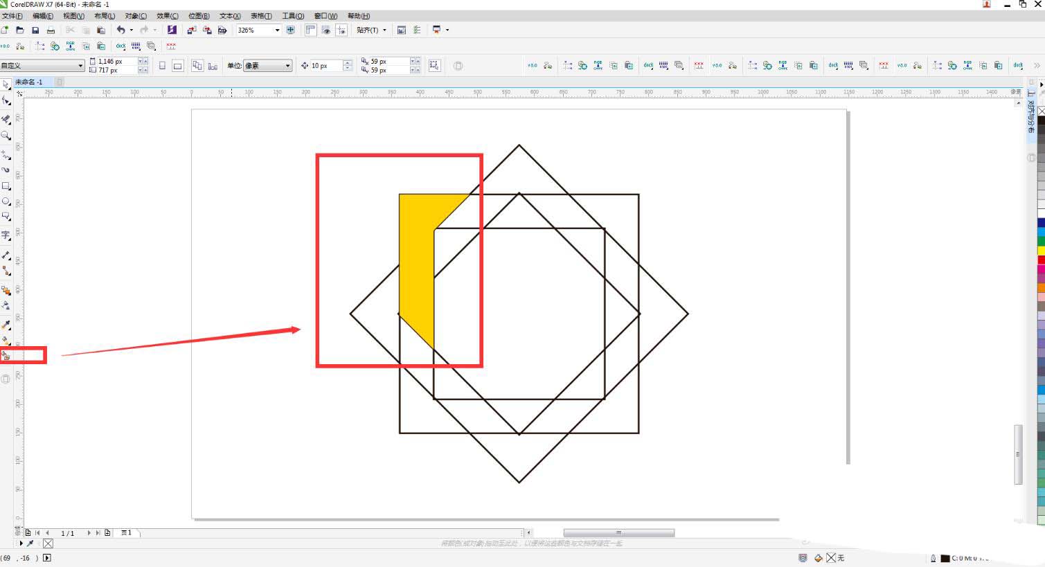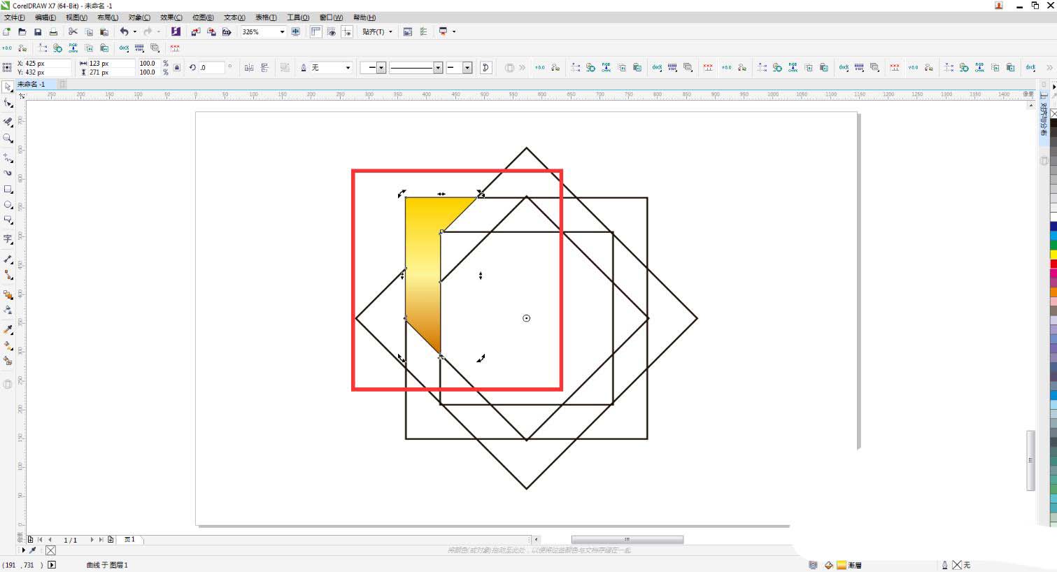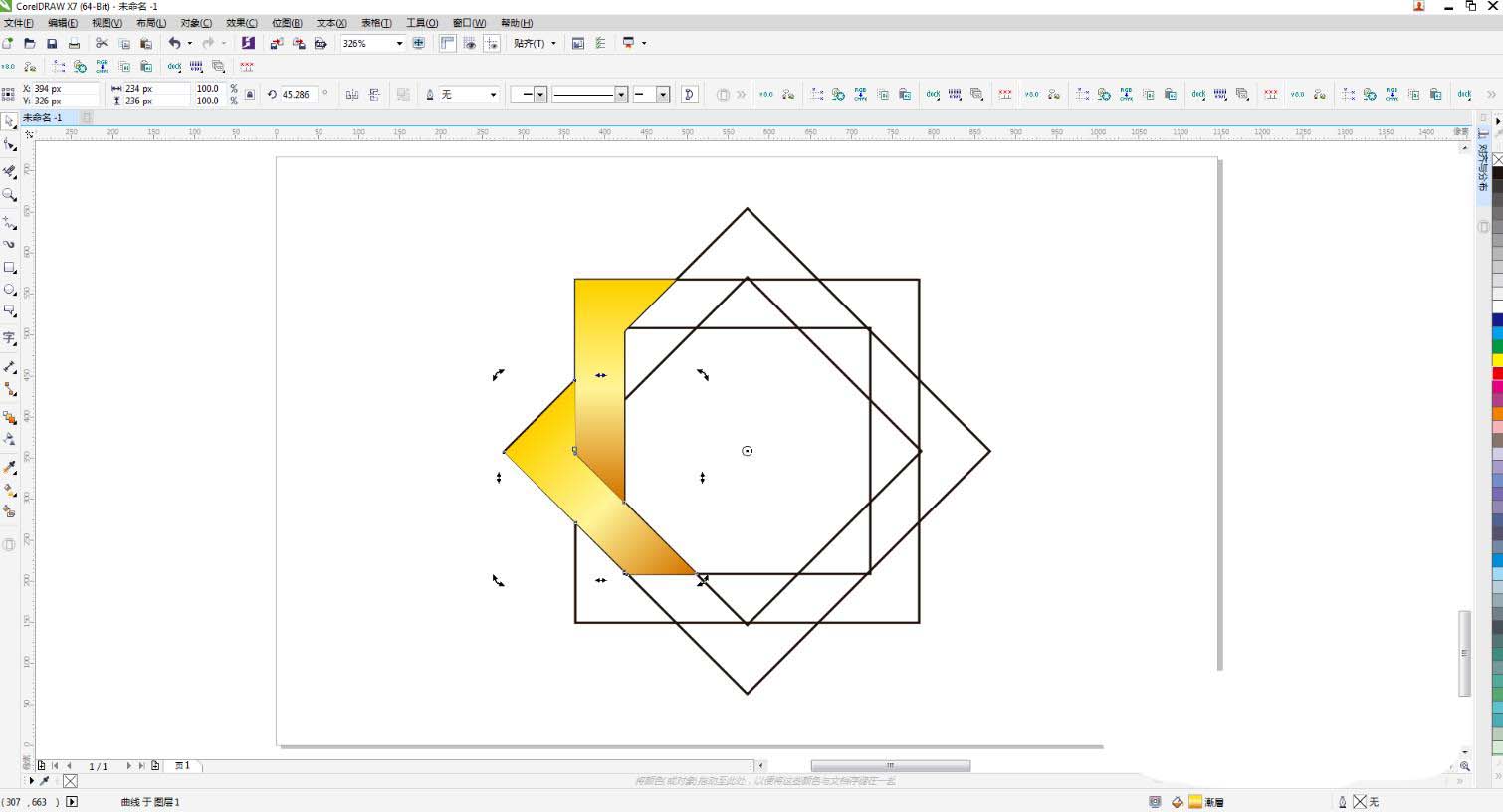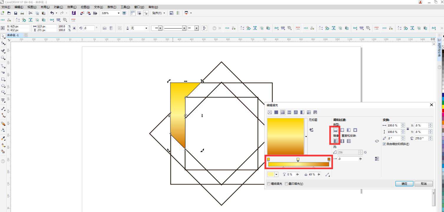 3、点击智能填充工具,给多边形填充颜色,然后按F11填充渐变色。把旋转中心点拖到矩形框的中心。