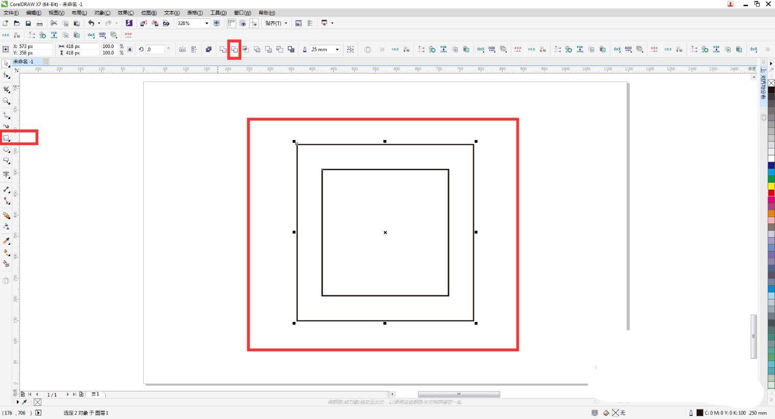 1、打开cdr软件新建文档,点击矩形工具绘制两个大小不一的同心矩形并修剪掉小的矩形。