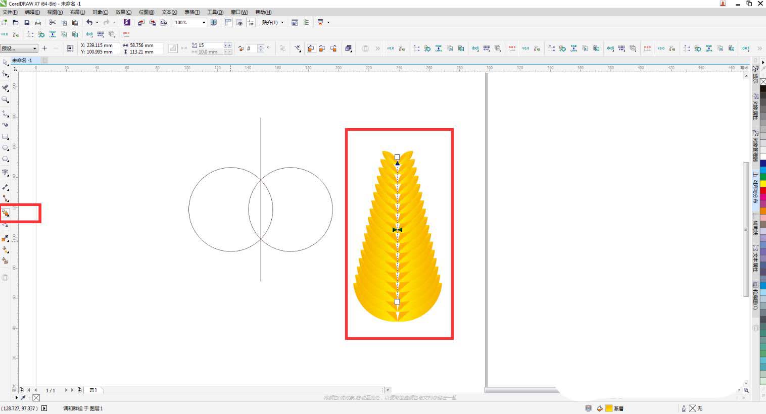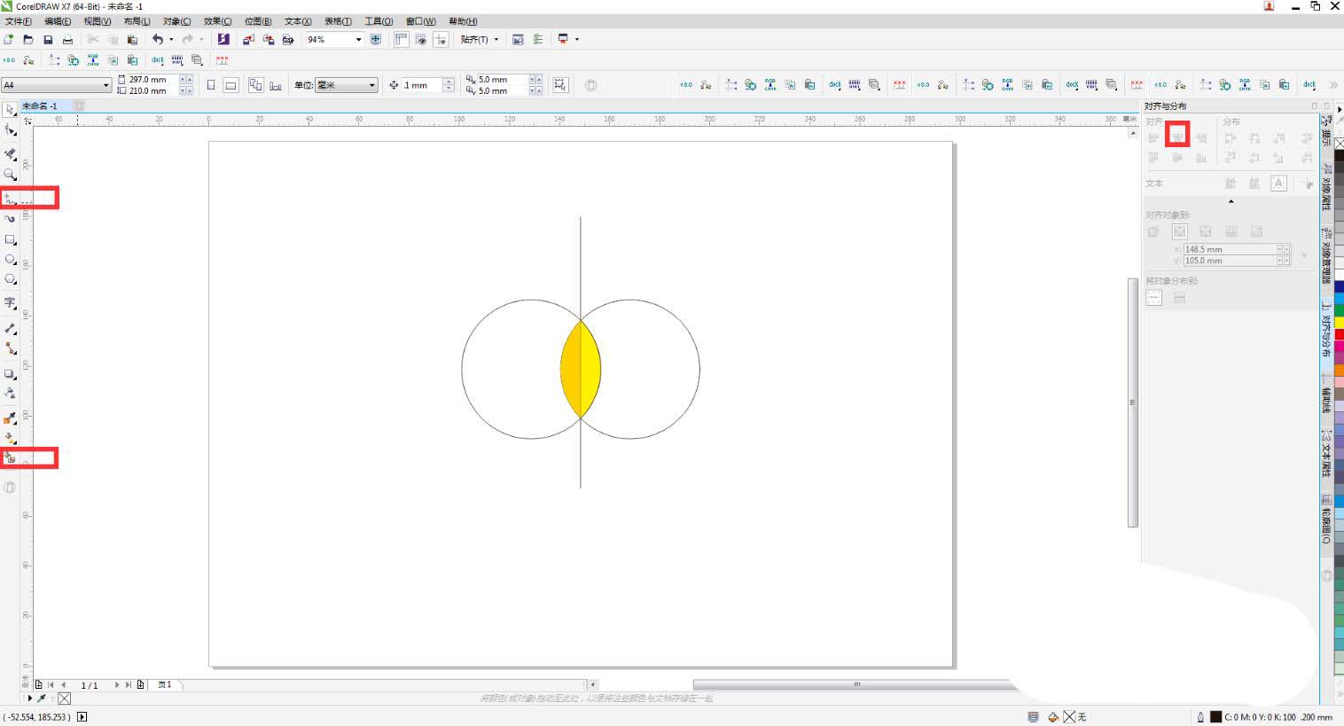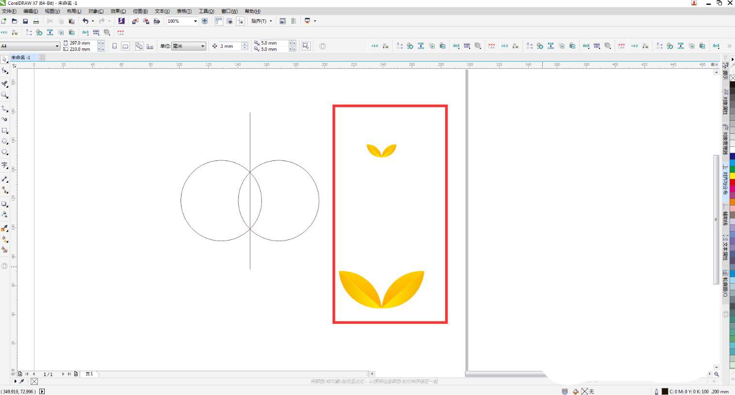 2、点击手绘工具,按住Ctrl键绘制一条垂直线与两个圆垂直居中,再点击智能填充工具给中间的小叶子填充成颜色。