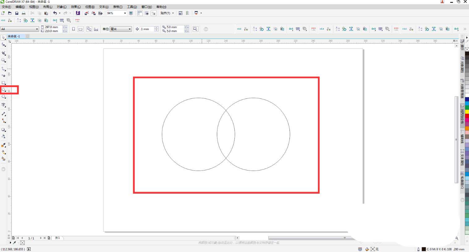 1、打开cdr软件并新建文档,点击椭圆工具按住Ctrl键绘制一个正圆,按住Shift键水平拖动正圆,点击鼠标右键复制正圆使两个正圆相交,按Ctrl+g组合起来。