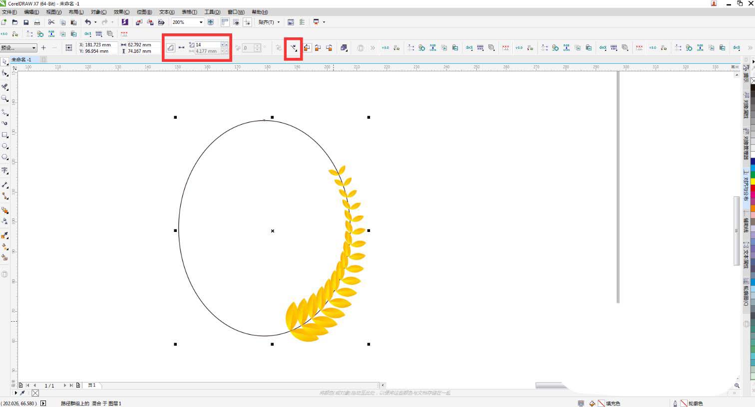 5、点击椭圆工具绘制一个椭圆,选择调和图形,点击新路径使调和图形沿椭圆路径,调整叶子的个数和步长,角度。