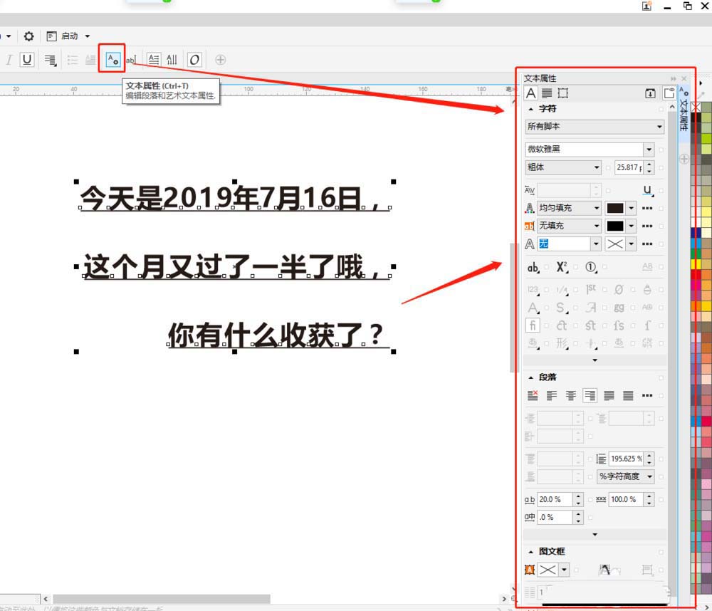 4、点击属性栏文本属性,快捷键是【CTRL+T】,可以调出【文本属性】泊坞窗,可以在泊坞窗里调整编辑美术字属性。这里的属性是特别全的哦!