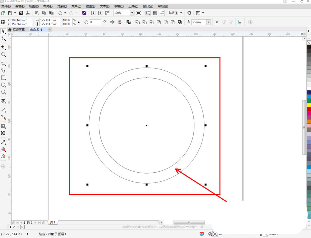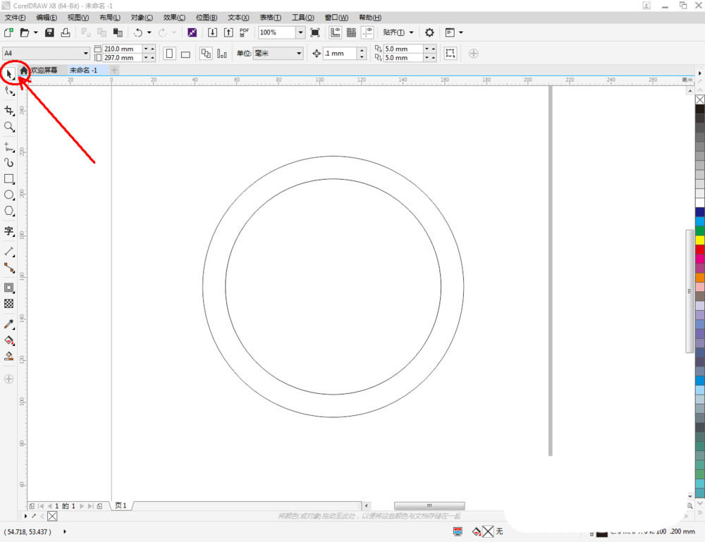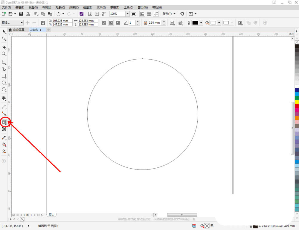 2、点击【椭圆形工具】在作图区域绘制一个圆形图案。点击【轮廓图】拉动圆形图案进行轮廓处理后,点击鼠标右键-【拆分轮廓图群组】将图案拆分(如图所示);
