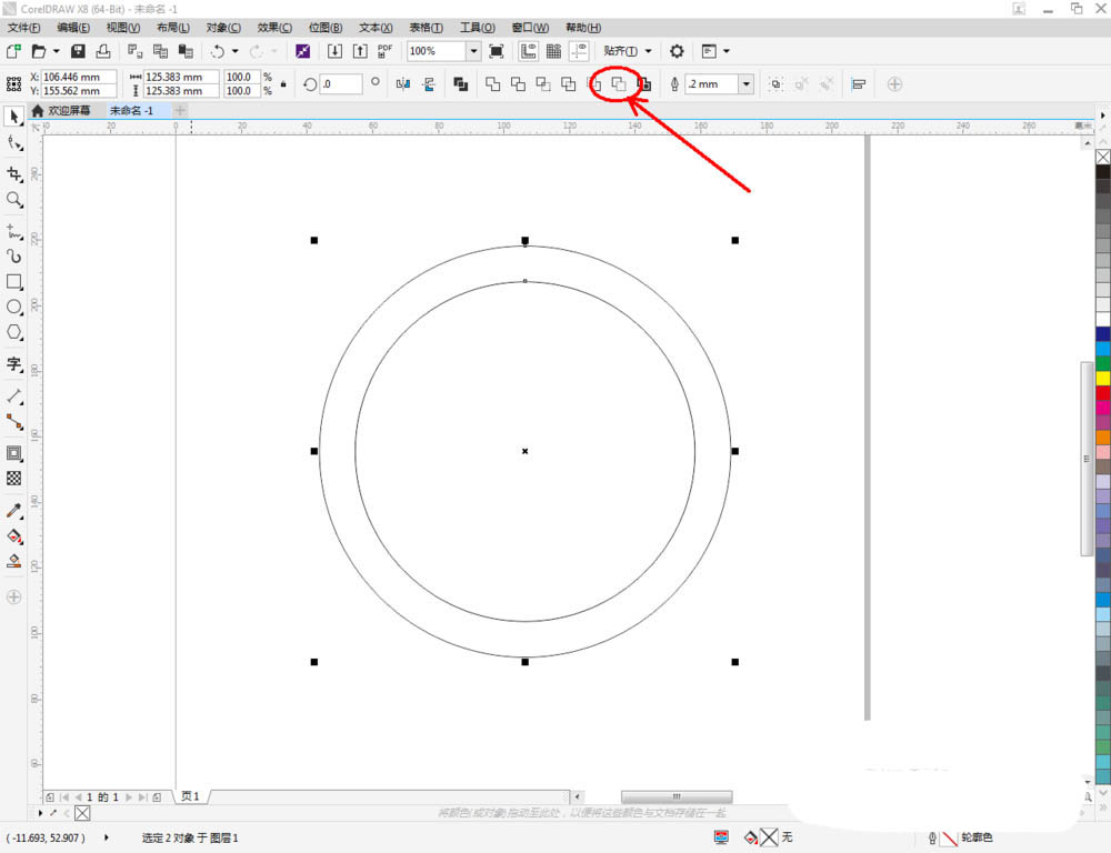 3、点击【选择工具】选中所有图案后,点击【移除前面对象】将前面部分的对象移除,得到一个圆环图案。选中图案,鼠标左键点击右边色板中的黑色,将图案填充为黑色;