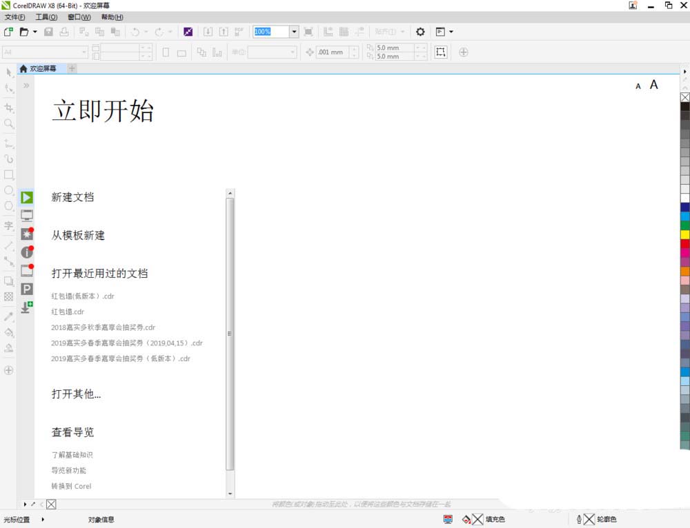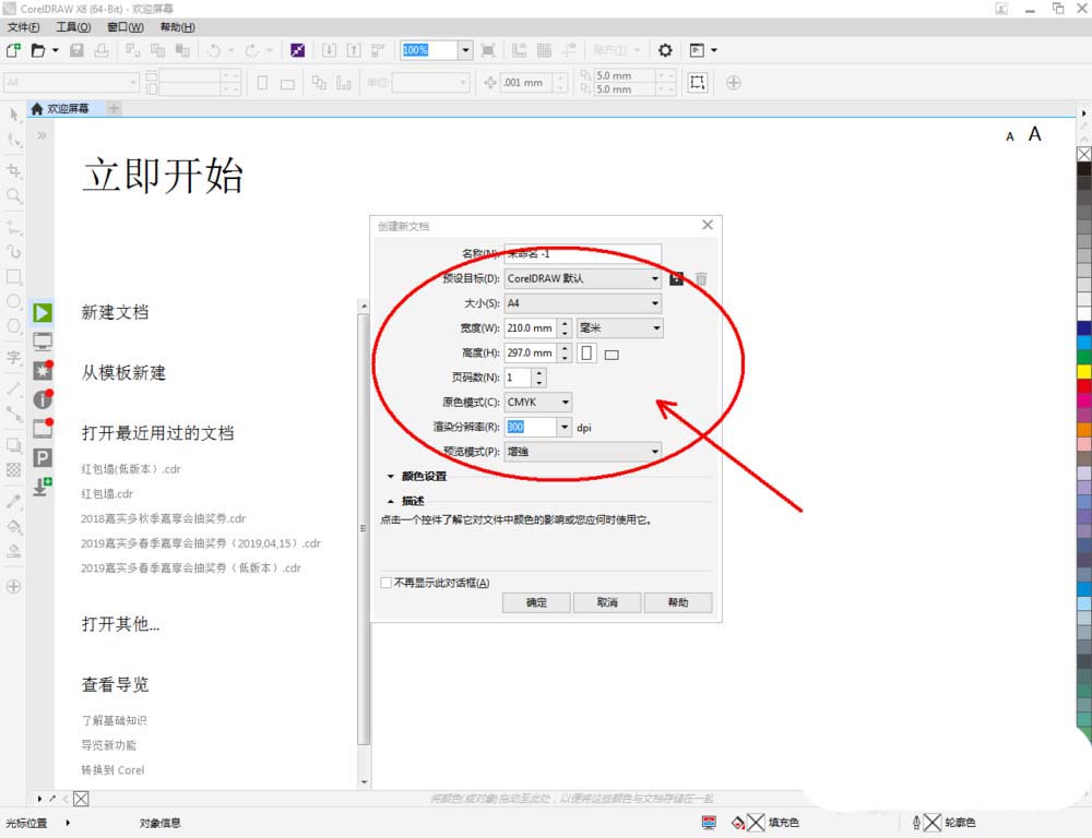 1、打开CorelDRAW X8 软件,点击【新建文档】,按图示参数新建一个cdr文档(如图所示);