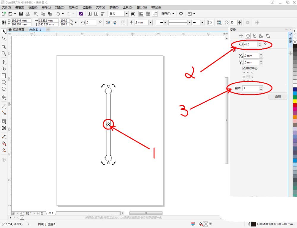 3、点击【对象】-【变换】-【旋转】,弹出变换设置框后,鼠标双击图案,将旋转角度设置为:45,副本数设置为:3后,对图案进行阵列(如图所示);,