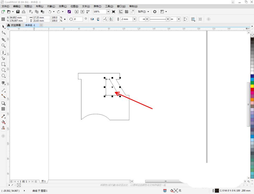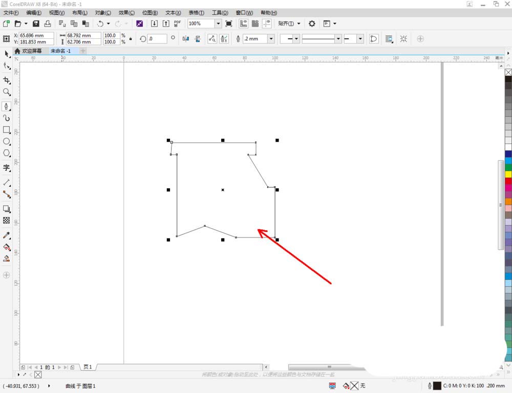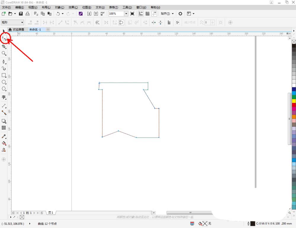 2、点击【钢笔工具】,按图示绘制一个多边图案。点击【形状工具】,选中图案上的所有点,点击【转换为曲线】将图案转曲后,按图示调整控制点(如图所示);