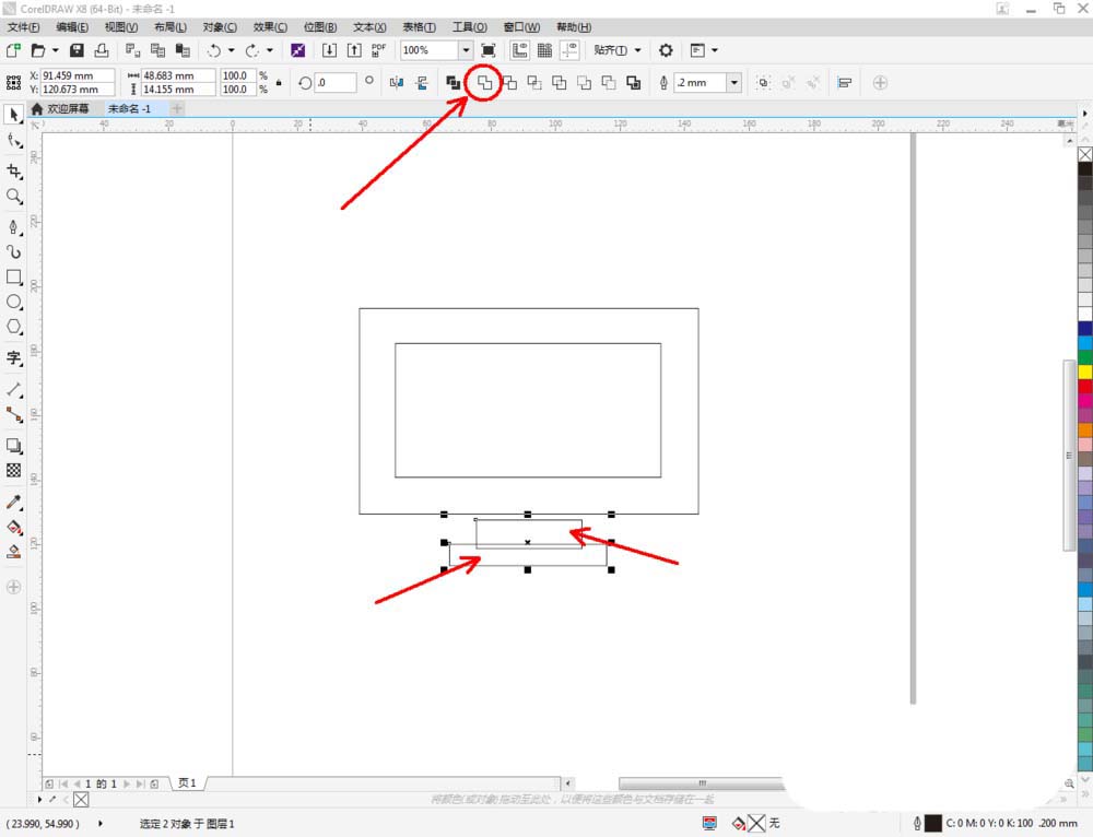 3、点击【选择工具】,选中显示器底座两个矩形图案,点击【合并】将两个图案合并为一体;选中显示屏两个矩形图案,点击【移除前面对象】将小矩形图案部分移除。完成后,选中两部分图案,点击【合并】将其合并为一体后,将其填充为黑色(如图所示);