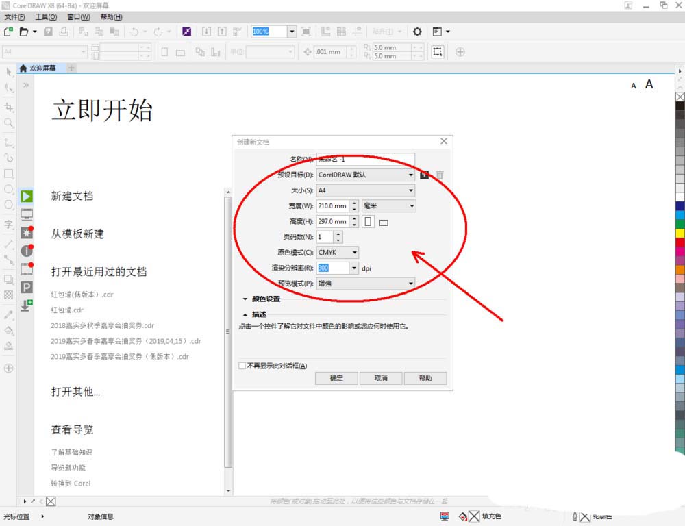 1、打开CorelDRAW X8 软件,点击【新建文档】,按图示参数新建一个cdr文档(如图所示);