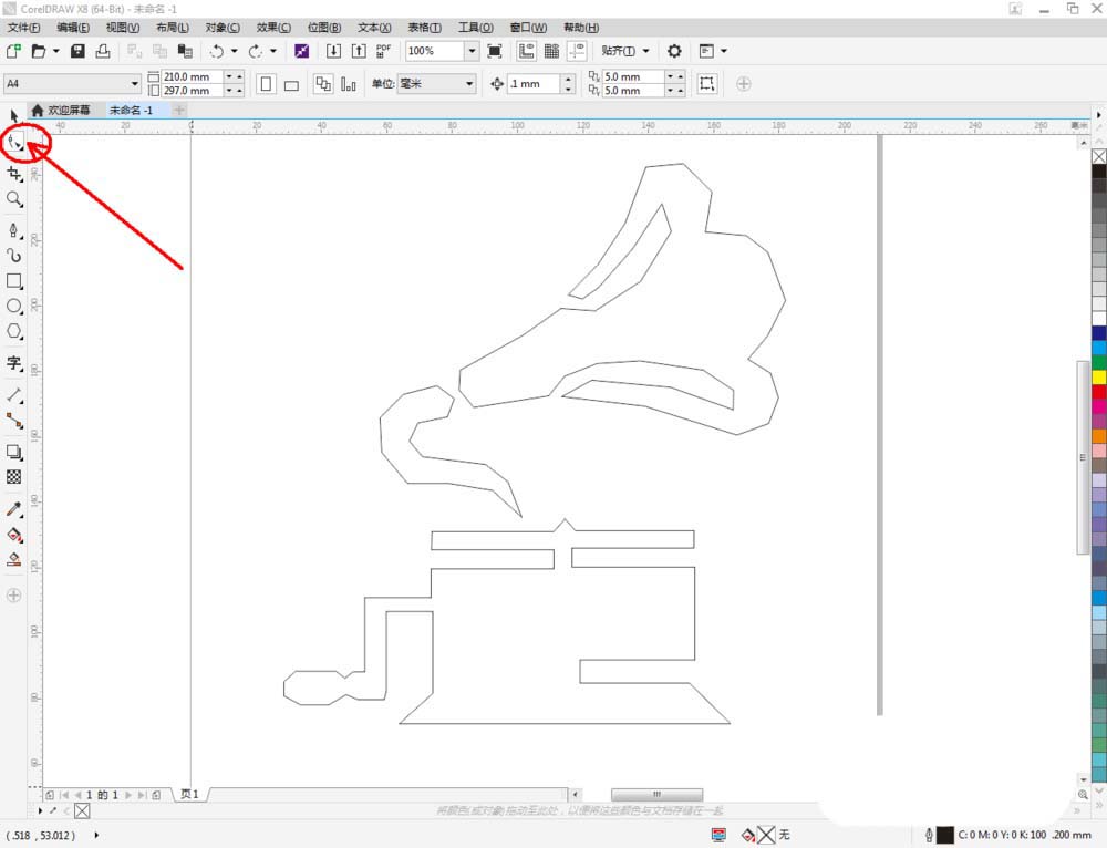 2、点击【钢笔工具】,按图示在作图区域绘制几个多边图案组成留声机图标的大致轮廓(如图所示);
