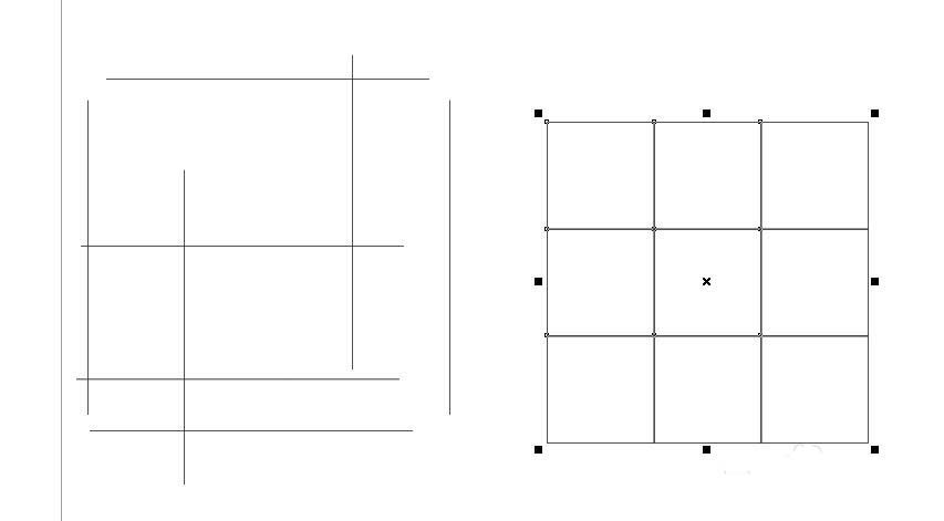 4、我们将左图(表格)打散并取消群组。Ctrl+K,Ctrl+U。发现表格是可以拆成单独的线。由此说明表格是多根直线结合而成的。