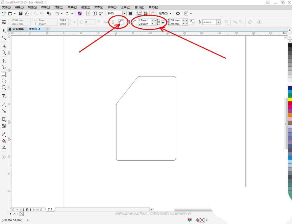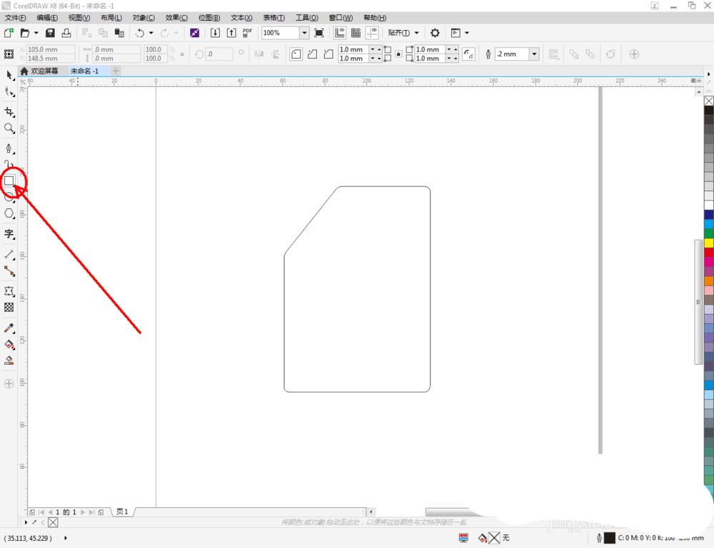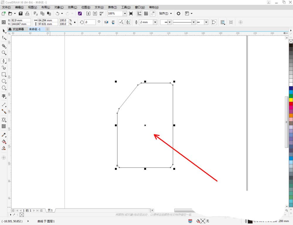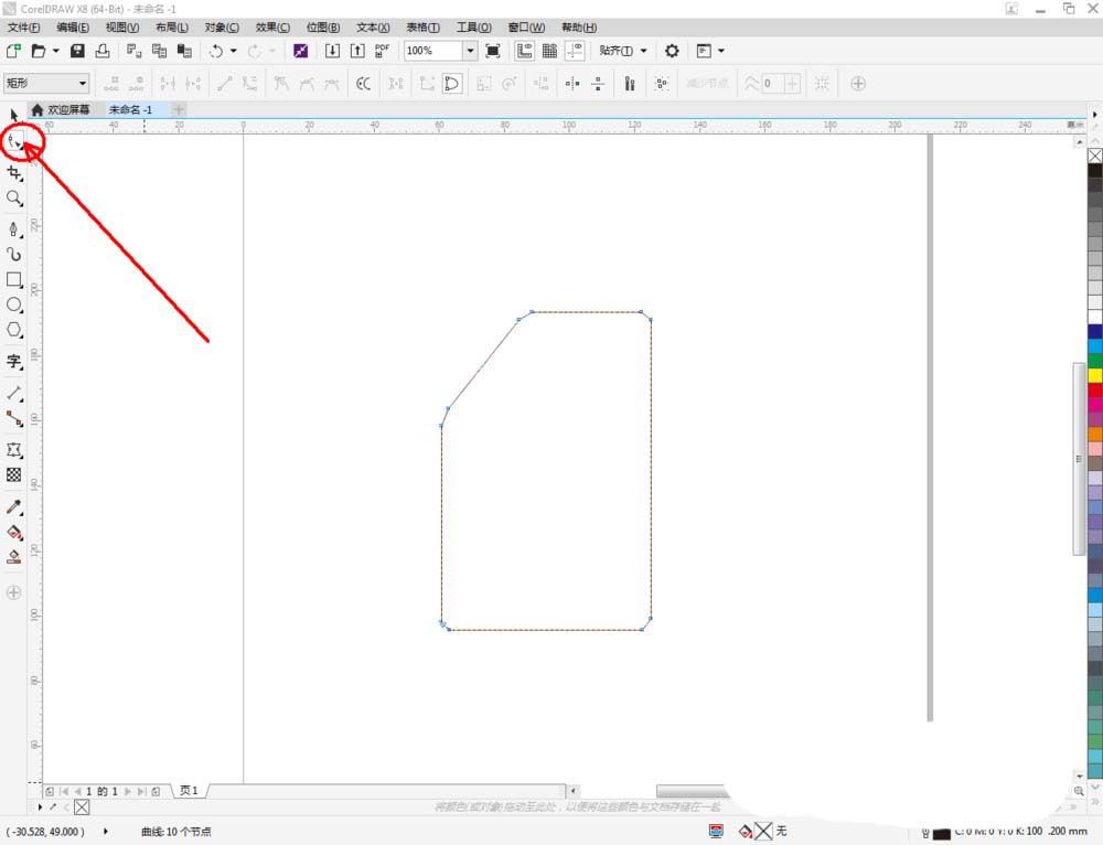 2、点击【钢笔工具】,按图示在作图区域绘制一个多边图案。点击【形状工具】,对图案上的节点进行移动调整。框选所有节点,点击【转换为曲线】将图案转曲后,按图示调整控制点,完成内存卡的轮廓图案制作(如图所示);
