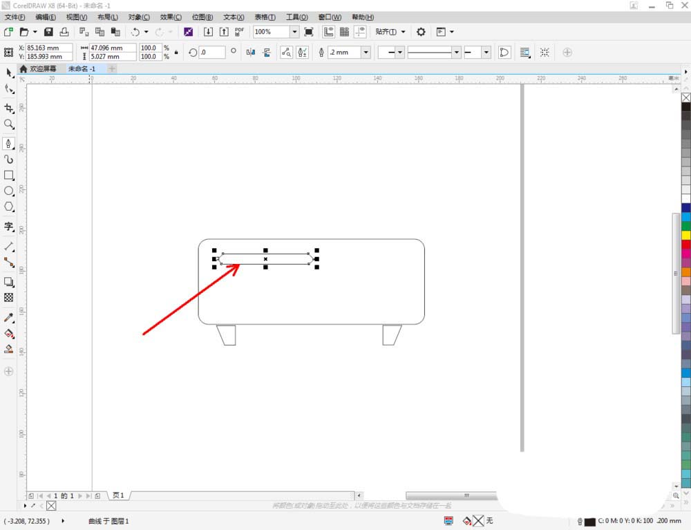2、点击【矩形工具】,在作图区域绘制一个矩形图案,点击【圆角】图标,将圆角参数设置为:5。点击【钢笔工具】绘制一个多边图案作为投影仪的支撑脚。拉动复制一个图案副本后,点击【镜像】对图案进行镜像操作(如图所示);