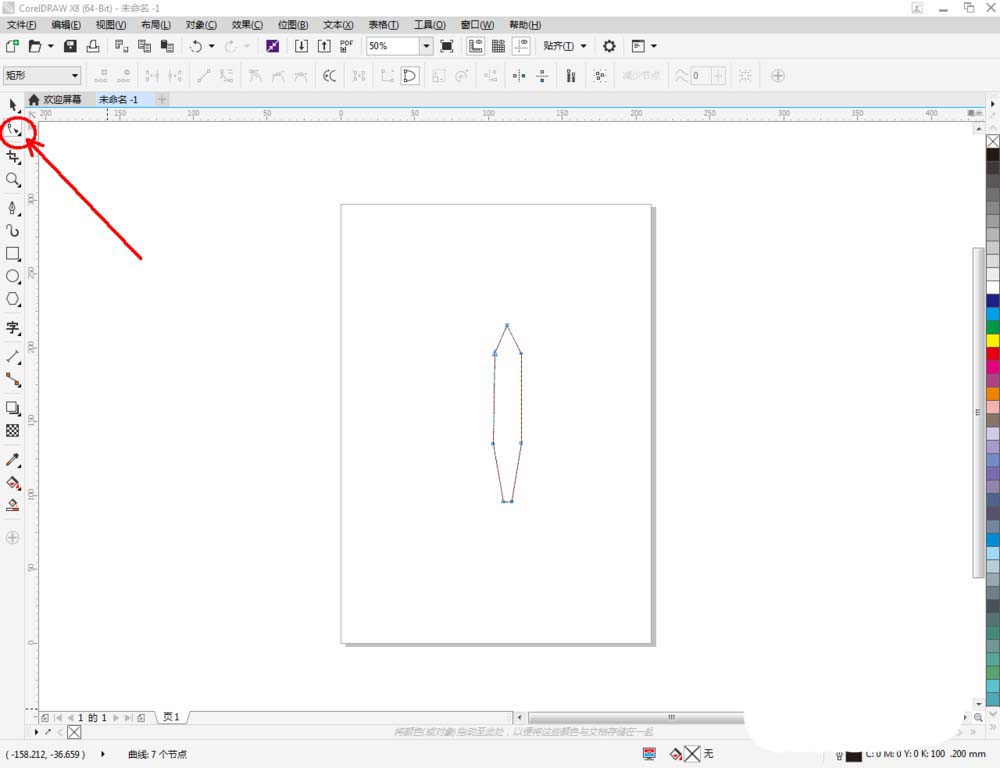 2、点击【钢笔工具】,按图示绘制一个多边图案。点击【形状工具】,选中图案上的所有点,点击【转换为曲线】将图案转曲后,按图示调整控制点,完成整个机身图案的绘制(如图所示);