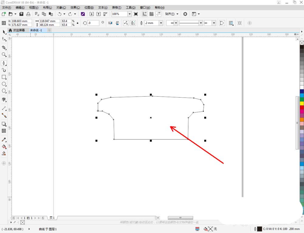 2、点击【钢笔工具】按图示在作图区域绘制出一个多边图案。点击【形状工具】,框选所有的节点后,点击【转化为曲线】将节点转曲。完成后,选中图示图案上的节点,点击【平滑节点】将节点进行平滑处理并调整好控制点(如图所示);