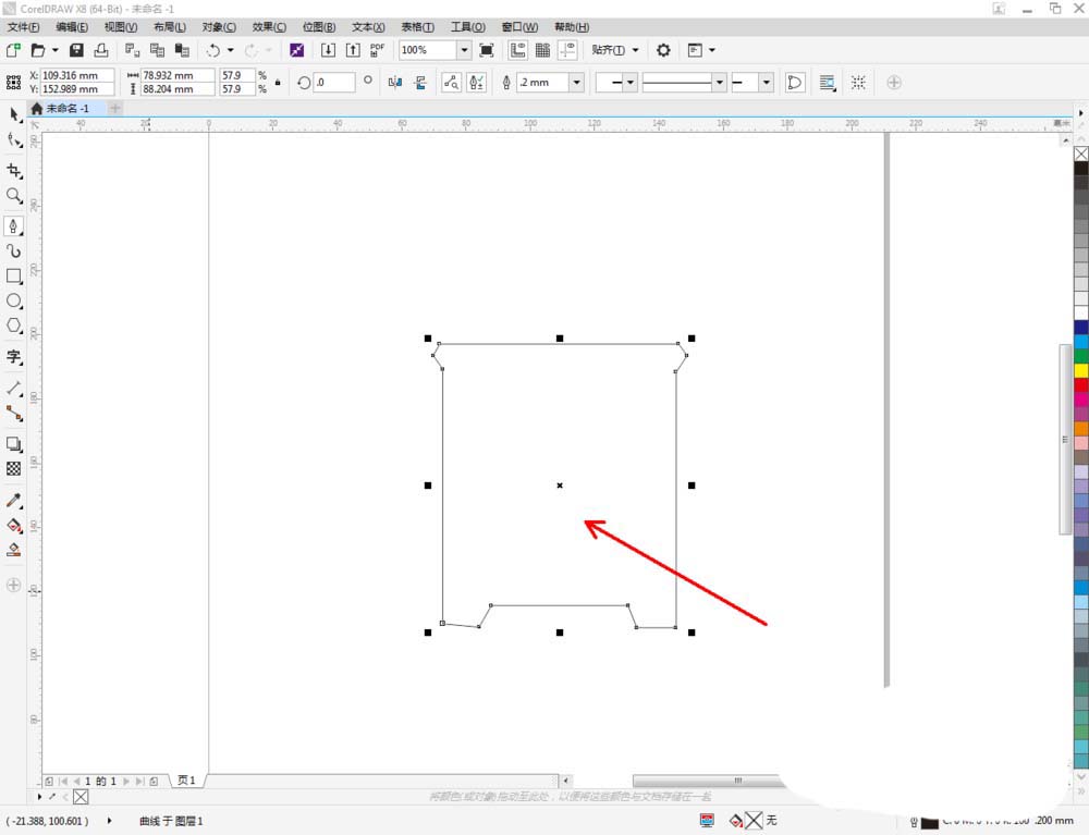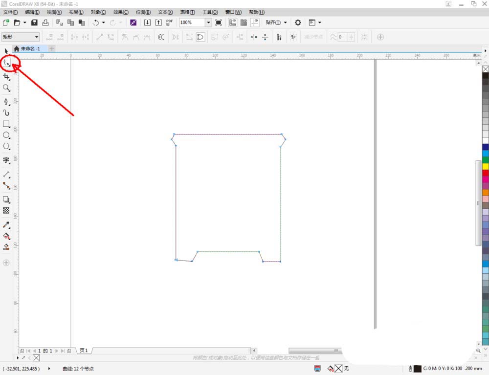 2、点击【钢笔工具】按图示在作图区域绘制出一个多边图案。点击【形状工具】,框选所有的节点后,点击【转化为曲线】将节点转曲。完成后,选中图示图案上的节点,点击【平滑节点】将节点进行平滑处理并调整好控制点(如图所示);