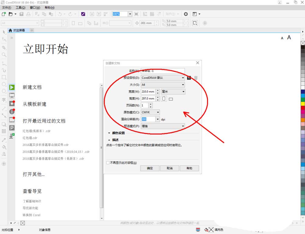 1、打开CorelDRAW X8 软件,点击【新建文档】,按图示参数新建一个cdr文档(如图所示);