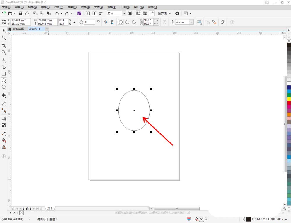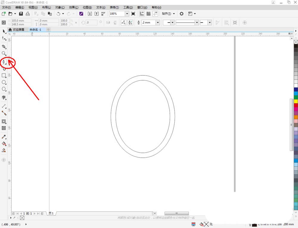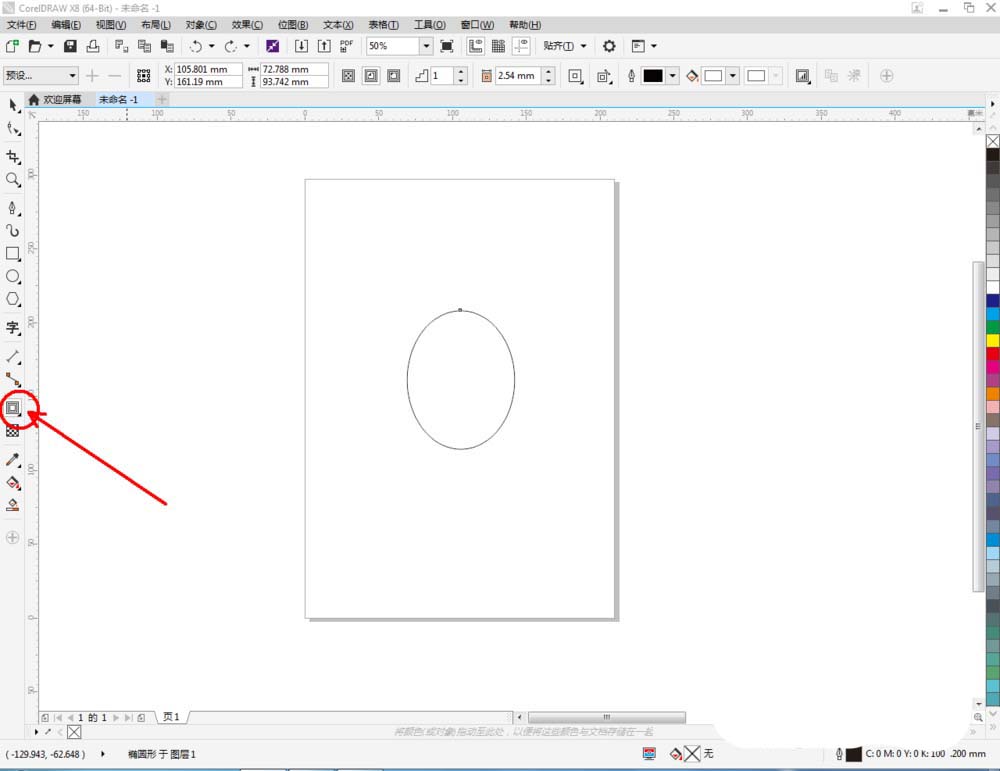 2、点击【椭圆形工具】按图示在作图区域绘制一个椭圆形图案后,点击【轮廓图】对图案进行轮廓处理。完成后,选中图案,点击鼠标右键-【拆分轮廓图群组】(如图所示);