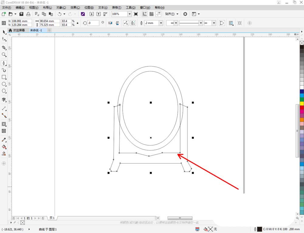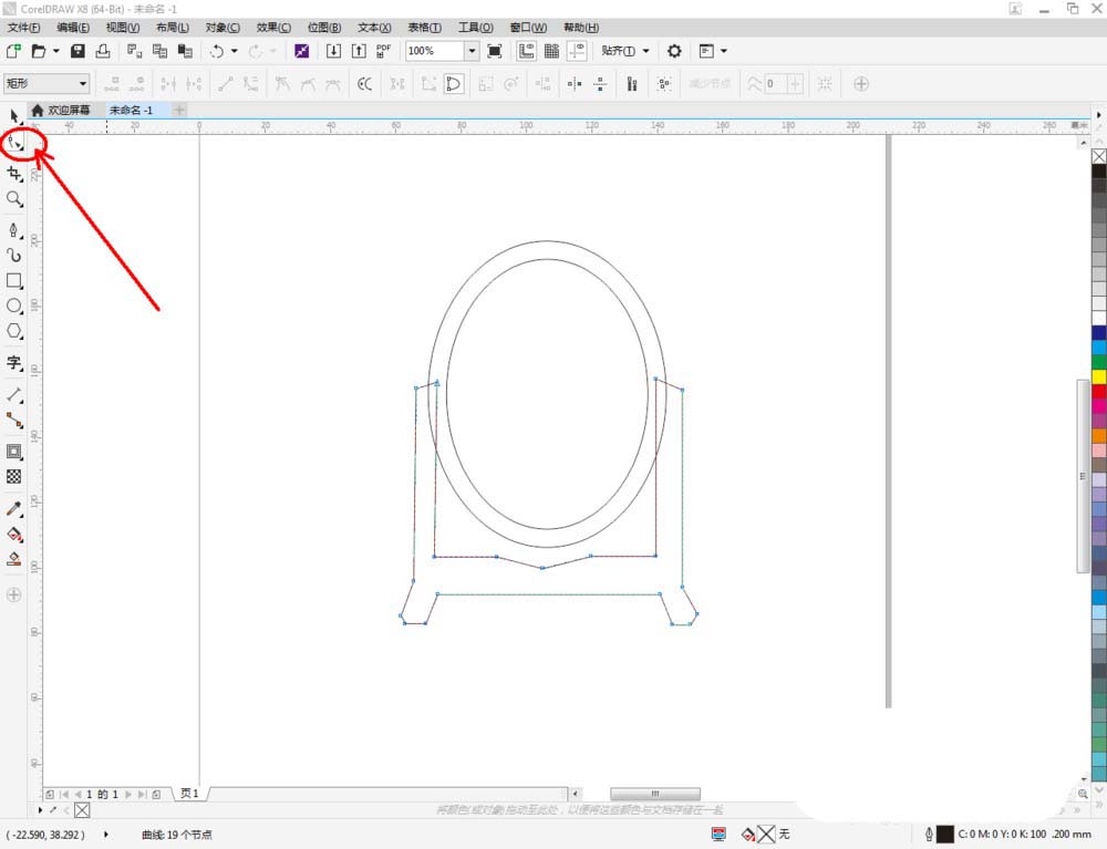 3、点击【钢笔工具】按图示在作图区域绘制出一个多边图案。点击【形状工具】,框选所有的节点后,点击【转化为曲线】将节点转曲。完成后,选中图示图案上的节点,点击【平滑节点】将节点进行平滑处理并调整好控制点(如图所示);