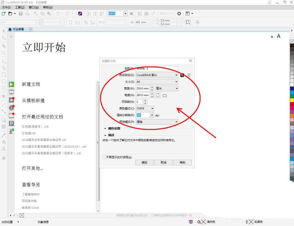 1、打开CorelDRAW X8 软件,点击【新建文档】,按图示参数新建一个cdr文档(如图所示);