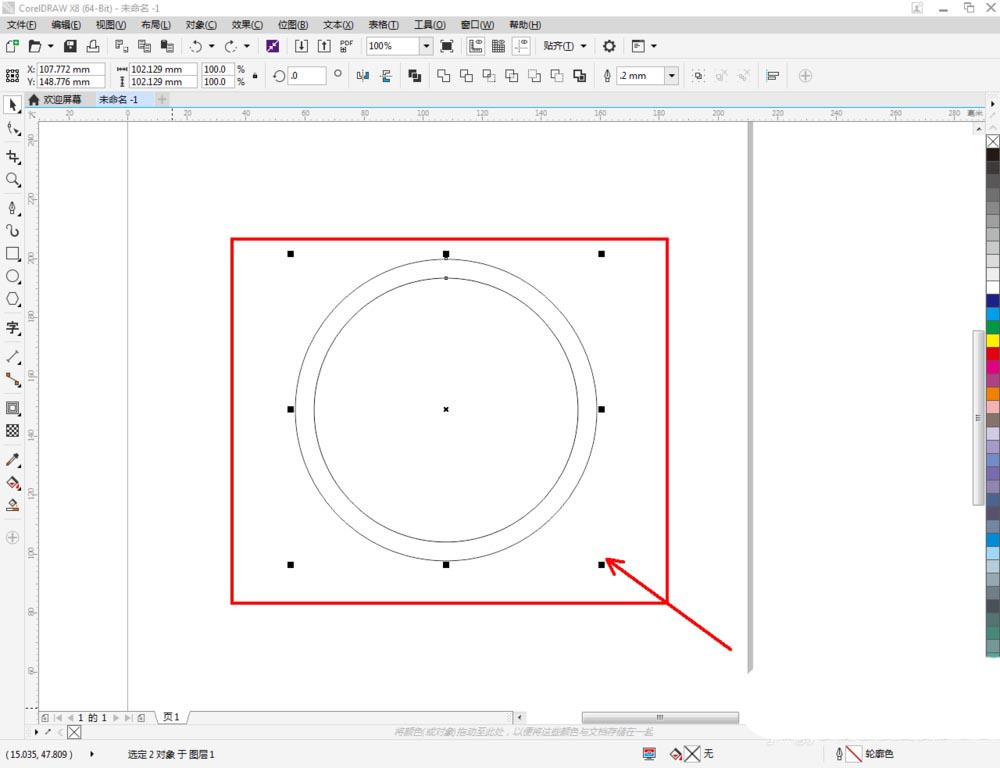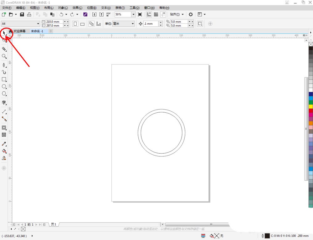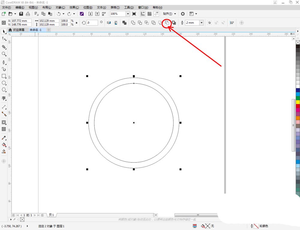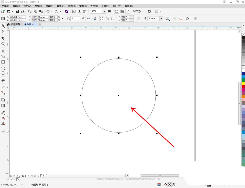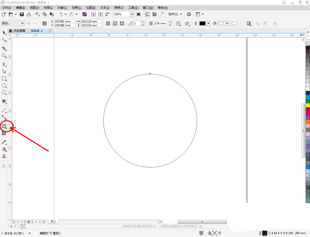 2、点击【椭圆形工具】在作图区域绘制一个圆形图案。点击【轮廓图】拉动圆形图案进行轮廓处理后,点击鼠标右键-【拆分轮廓图群组】将图案拆分(如图所示);