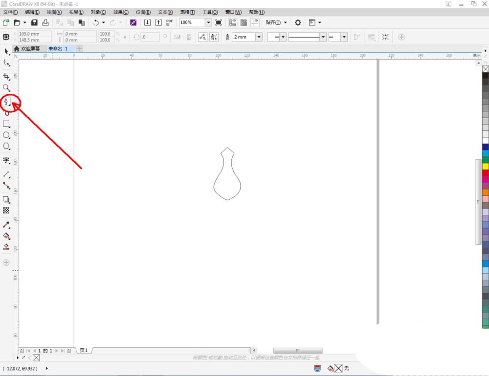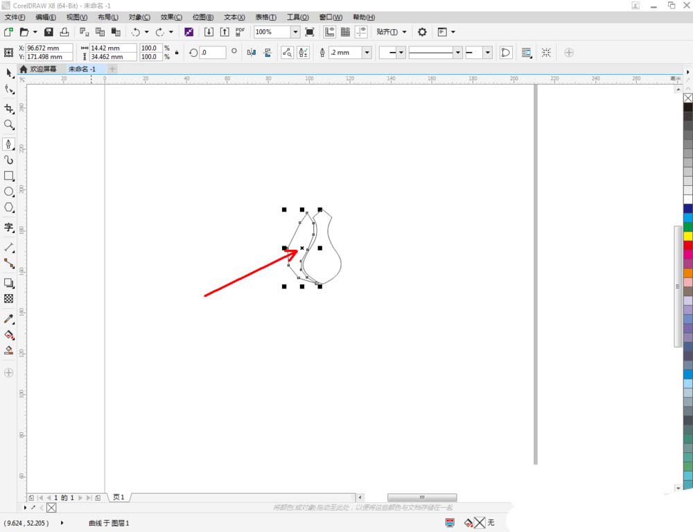 2、点击【钢笔工具】在图示区域绘制一个多边图案后,点击【形状工具】,框选图案上的节点,点击【转化为曲线】将节点转曲。完成后,选中图示图案上的节点,点击【平滑节点】将节点进行平滑处理并调整好控制点(如图所示);