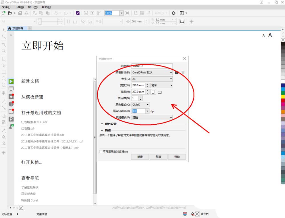1、打开CorelDRAW X8 软件,点击【新建文档】,按图示参数新建一个cdr文档(如图所示);