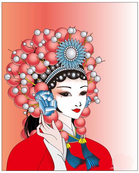2、填充颜色,脸的部分可以选择使用网状填充工具,整体的明暗要划分好,暗面可以也用渐变填充和阴影工具来表现,发冠上的珠子和装饰建议先做出一个来,然后复制、调整,这样可以很快速的完成这繁琐的头饰。