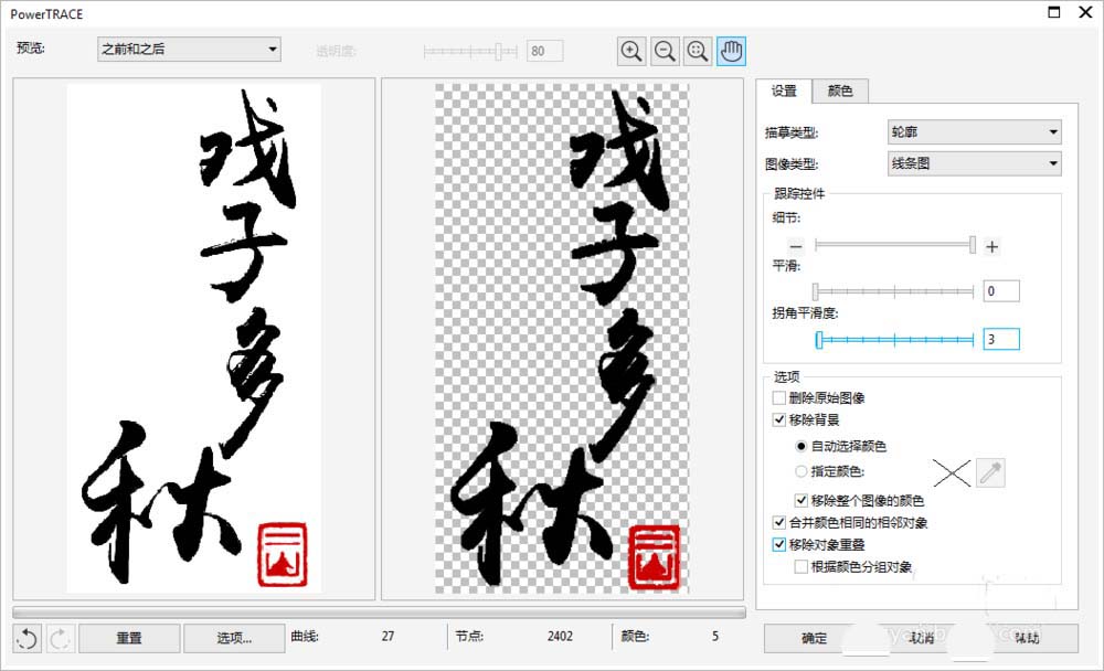3、添加古风文字,小编电脑受字体限制,所以网上随意找的一个字体,导进CDR,执行描摹位图操作。