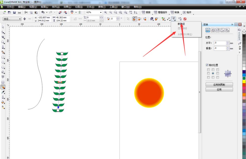 7、叶子做好以后单击属性栏路径属性选择新路径,在画好的曲线上单击。