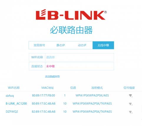 4、选择需要中继的无线名称,输入无线密码,即可实现对该无线WiFi的中继。