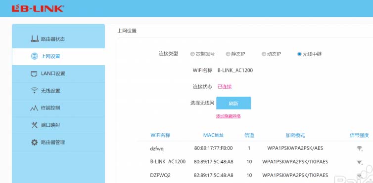 5、在“上网设置”页面中,可以随时对中继的WiFi进行更换调整。