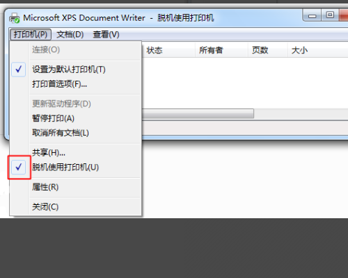 4、单击打印机菜单,打开下拉列表,在脱机使用打印机选项前单击一下,把勾去掉。