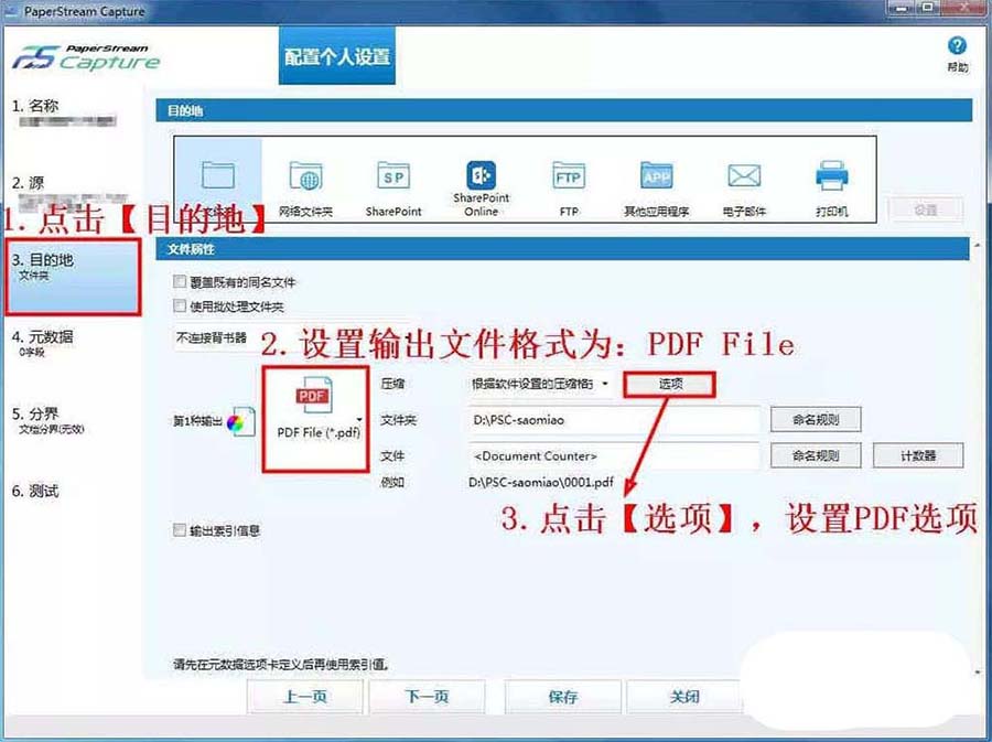 6、点击【目的地】,设置输出文件格为:PDF File,点击【选项】,设置PDF选项,如下图所示: