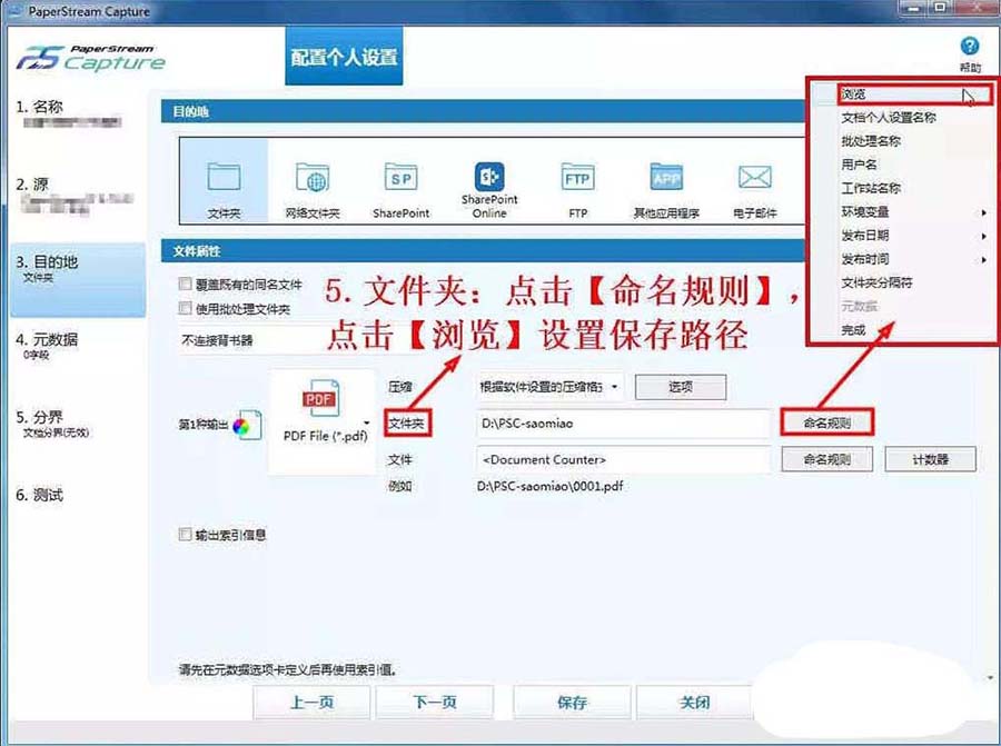 8、设置文件夹,点击【命名规则】,点击【浏览】设置保存路径,如下图所示: