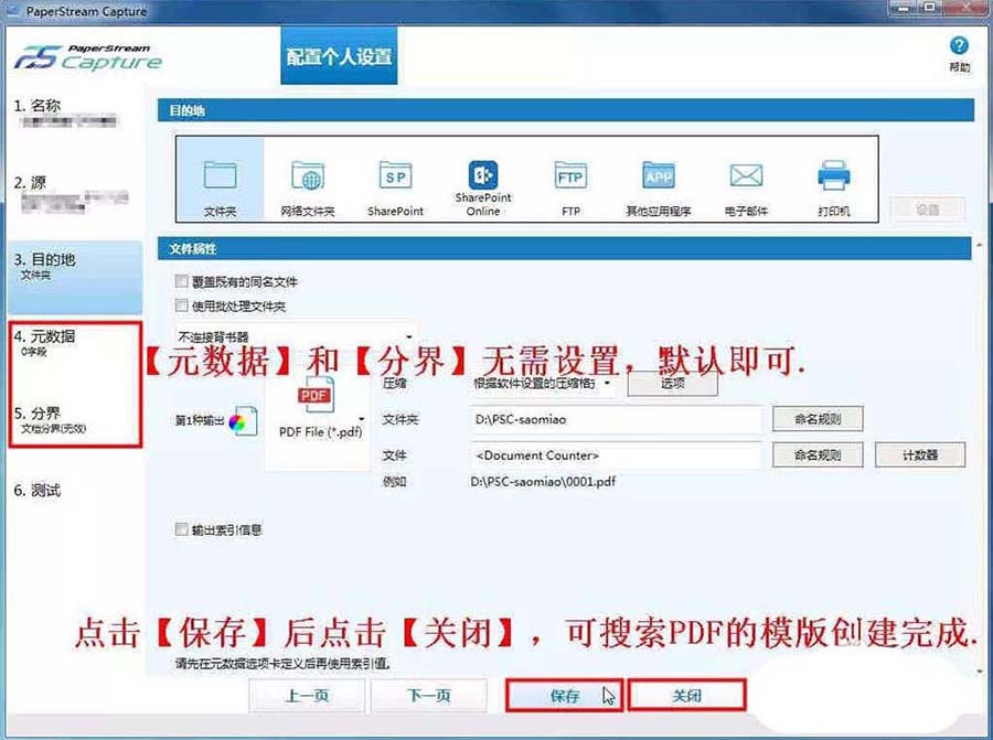 10、最后点击【保存】,【关闭】,退出设置窗口,可搜索PDF的模版创建完成