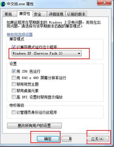 7、选择windows xp service pack3 兼容模式,点击应用,最后确定即可。
