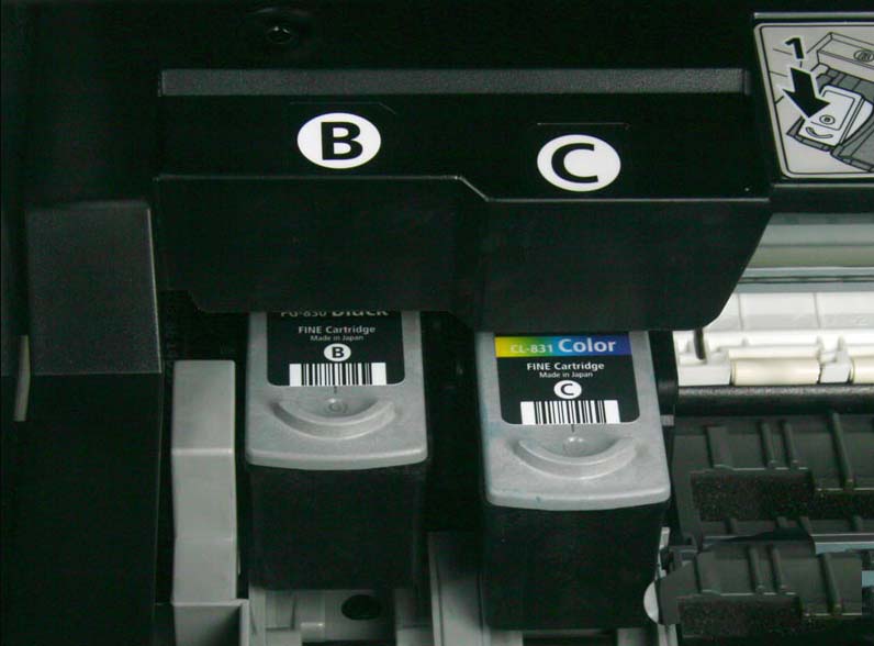 3、新墨盒一定要对应相应的字母,把加好墨水新盒推进去,盖上打印机盖