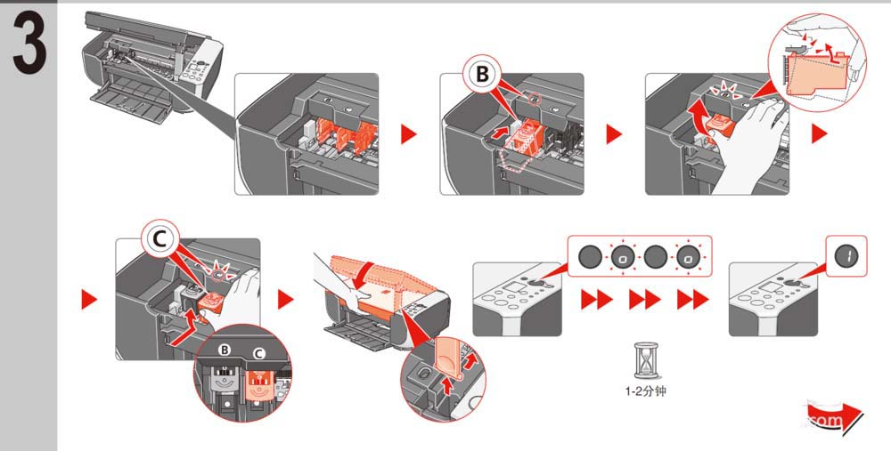 2、一个B盒一个C盒把用完的拿出来把新的放进去,这个时候要等待20秒让机器自检完成打印头会回归较正位0