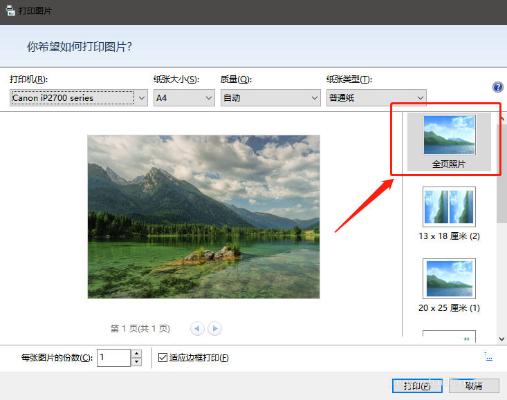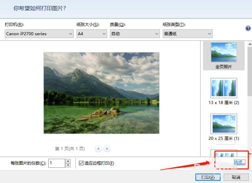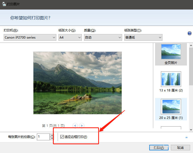 2、打开打印功能后,弹出打印图片设置界面;默认是已勾选适应边框打印;