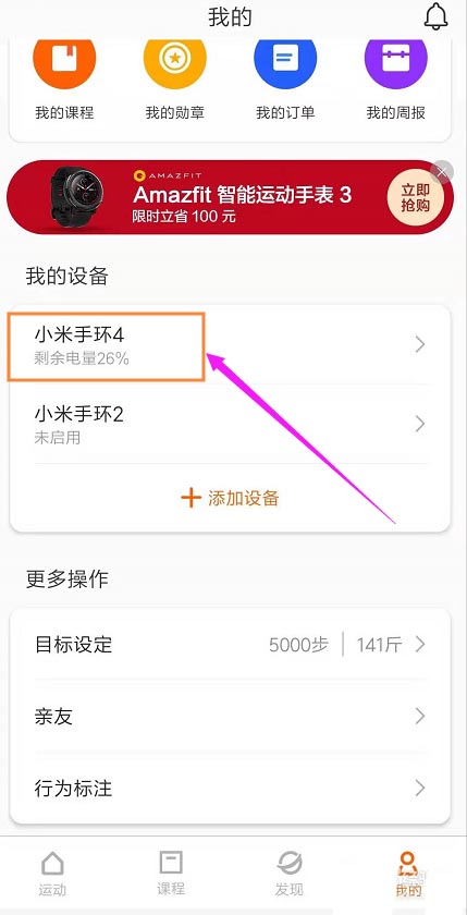 3、在我的界面中,点击【小米手环4】,进入到手环设置中。