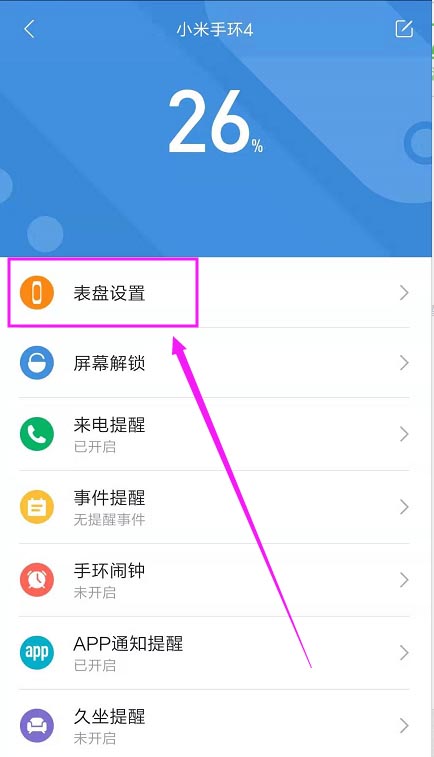 ②点击【小米手环4】,进入到手环设置中,点击【表盘设置】。