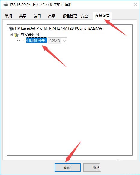 7、之后我们点击设备设置,然后我们就可以看到打印机内存了,之后我们点击确定即可。