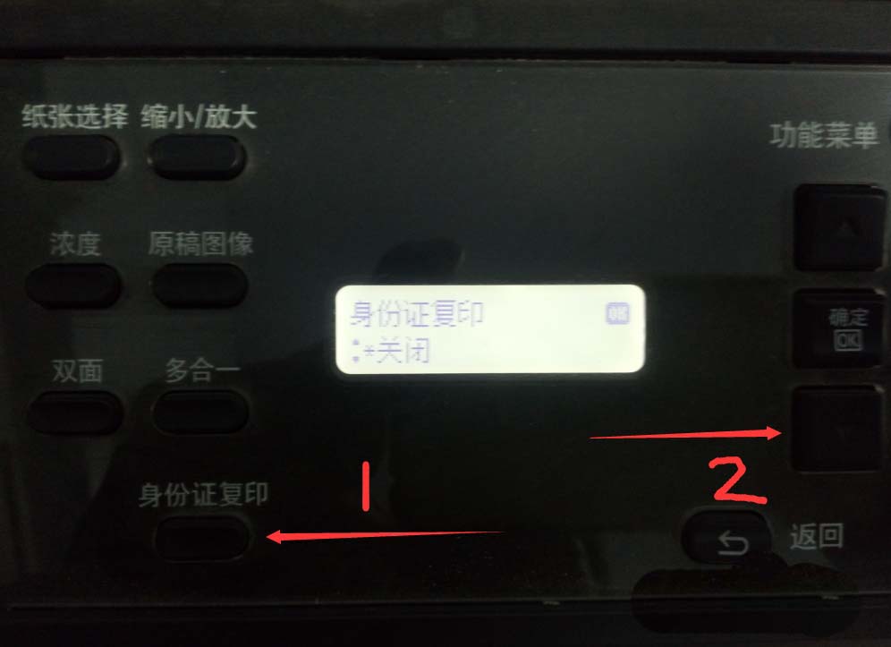 1、打印机开机状态下,按下身份证复印,并调节方向键下键改为开启状态。