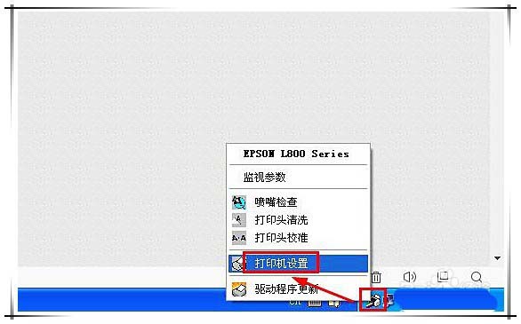 3、或者,也可以直接在右下角任务栏中找到EPSON L800 打印机图标,右击,弹出菜单中选择“打印机设置”。