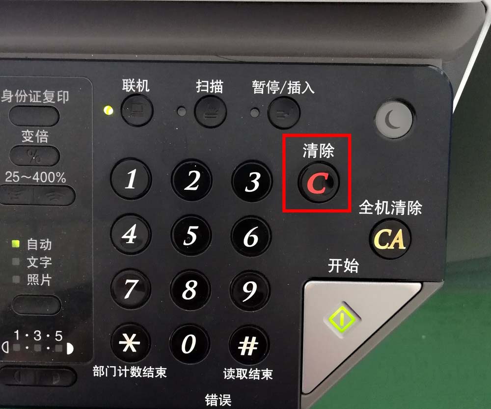 5、复印完成后,主面板的份数显示值会恢复到之前设定的“20”,为了避免别人误碰到“开始”键重复复印操作,可以将份数清零,按下“清除”键即可。