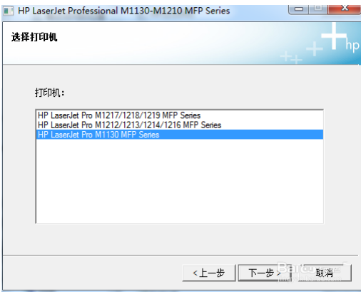 7、进入选择打印机界面,选择对应的打印机型号,这里选择最后一个,HP LaserJet Pro M1130 MFP Series,选中后下一步,如下图所示