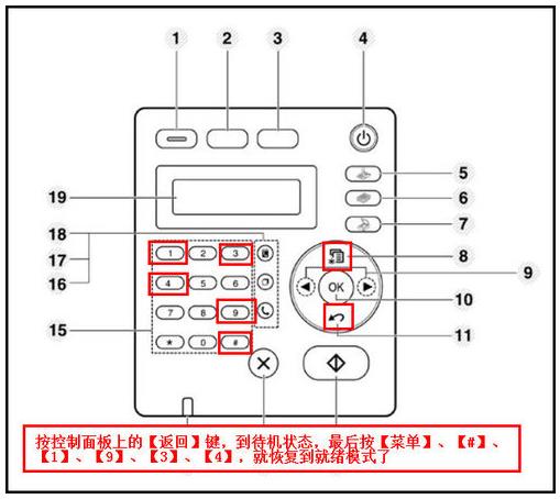 6)按控制面板上的【返回】键,到待机状态,最后按【菜单】、【#】、【1】、【9】、【3】、【4】,就恢复到就绪模式了,您再尝试传真操作就可以了。