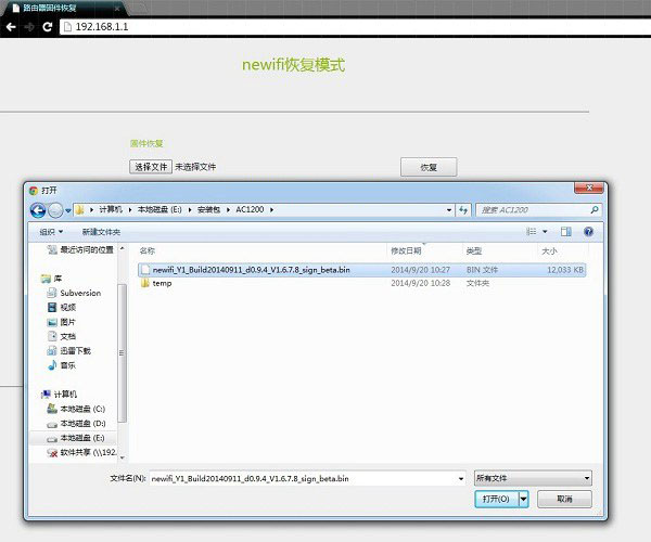 最后通过浏览的方式,找到我们自家下载的适配固件,打开之后即可进行联想newifi mini固件升级,如下图所示。