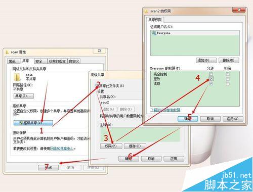 4、创建一个“scan”的文件夹,右键-属性-共享,按照图示要求按顺序设置好